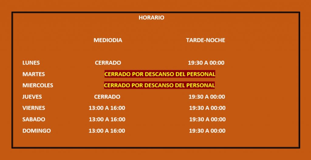 Martes y Miércoles Cerrado por descanso del personal. Gracias!!